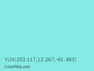 YUV 203.117,12.267,-61.493 Color is a light cyan color and the nearest color is Riptide #8be6d8. Hex code #85eae4 and RGB value is rgb(133,234,228). In RGB color space, this color is composed of 52% red, 92% green, 89% blue, In CMYK color space, this color is composed of 43% cyan, 0% magenta, 3% yellow , 8% black , In HSL color space, this color has a hue angle of 176° , 71% saturation and 72% lightness.