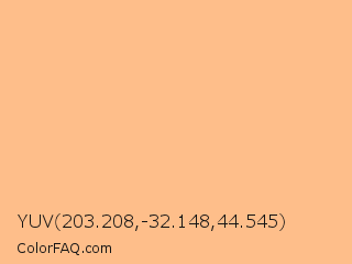 YUV 203.208,-32.148,44.545 Color is a light orange color and the nearest color is Macaroni And Cheese #ffbd88. Hex code #febe8a and RGB value is rgb(254,190,138). In RGB color space, this color is composed of 100% red, 75% green, 54% blue, In CMYK color space, this color is composed of 0% cyan, 25% magenta, 46% yellow , 0% black , In HSL color space, this color has a hue angle of 27° , 98% saturation and 77% lightness.