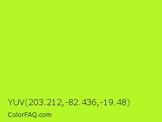 YUV 203.212,-82.436,-19.48 Color is a normal lime color and the nearest color is Green Yellow #adff2f. Hex code #b5f724 and RGB value is rgb(181,247,36). In RGB color space, this color is composed of 71% red, 97% green, 14% blue, In CMYK color space, this color is composed of 27% cyan, 0% magenta, 85% yellow , 3% black , In HSL color space, this color has a hue angle of 79° , 93% saturation and 55% lightness.
