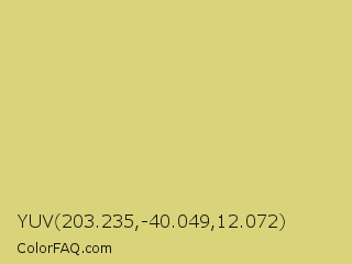 YUV 203.235,-40.049,12.072 Color is a light yellow color and the nearest color is Chenin #dfcd6f. Hex code #d9d47a and RGB value is rgb(217,212,122). In RGB color space, this color is composed of 85% red, 83% green, 48% blue, In CMYK color space, this color is composed of 0% cyan, 2% magenta, 44% yellow , 15% black , In HSL color space, this color has a hue angle of 57° , 56% saturation and 66% lightness.