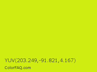 YUV 203.249,-91.821,4.167 Color is a normal yellow color and the nearest color is Las Palmas #c6e610. Hex code #d0ed11 and RGB value is rgb(208,237,17). In RGB color space, this color is composed of 82% red, 93% green, 7% blue, In CMYK color space, this color is composed of 12% cyan, 0% magenta, 93% yellow , 7% black , In HSL color space, this color has a hue angle of 68° , 87% saturation and 50% lightness.