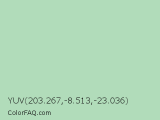YUV 203.267,-8.513,-23.036 Color is a light green color and the nearest color is Fringy Flower #b1e2c1. Hex code #b1dcba and RGB value is rgb(177,220,186). In RGB color space, this color is composed of 69% red, 86% green, 73% blue, In CMYK color space, this color is composed of 20% cyan, 0% magenta, 15% yellow , 14% black , In HSL color space, this color has a hue angle of 133° , 38% saturation and 78% lightness.