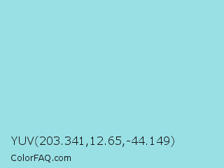 YUV 203.341,12.65,-44.149 Color is a light cyan color and the nearest color is Morning Glory #9edee0. Hex code #99e0e5 and RGB value is rgb(153,224,229). In RGB color space, this color is composed of 60% red, 88% green, 90% blue, In CMYK color space, this color is composed of 33% cyan, 2% magenta, 0% yellow , 10% black , In HSL color space, this color has a hue angle of 184° , 59% saturation and 75% lightness.