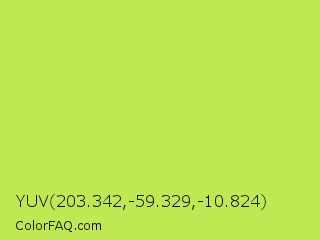 YUV 203.342,-59.329,-10.824 Color is a light lime color and the nearest color is June Bud #bdda57. Hex code #bfe953 and RGB value is rgb(191,233,83). In RGB color space, this color is composed of 75% red, 91% green, 33% blue, In CMYK color space, this color is composed of 18% cyan, 0% magenta, 64% yellow , 9% black , In HSL color space, this color has a hue angle of 77° , 77% saturation and 62% lightness.