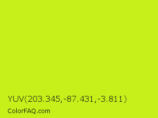 YUV 203.345,-87.431,-3.811 Color is a normal lime color and the nearest color is Las Palmas #c6e610. Hex code #c7f01a and RGB value is rgb(199,240,26). In RGB color space, this color is composed of 78% red, 94% green, 10% blue, In CMYK color space, this color is composed of 17% cyan, 0% magenta, 89% yellow , 6% black , In HSL color space, this color has a hue angle of 71° , 88% saturation and 52% lightness.