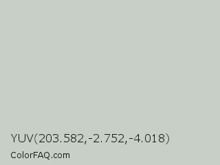 YUV 203.582,-2.752,-4.018 Color is a light green color and the nearest color is Pumice #c2cac4. Hex code #c7cfc6 and RGB value is rgb(199,207,198). In RGB color space, this color is composed of 78% red, 81% green, 78% blue, In CMYK color space, this color is composed of 4% cyan, 0% magenta, 4% yellow , 19% black , In HSL color space, this color has a hue angle of 113° , 9% saturation and 79% lightness.