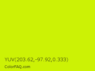 YUV 203.62,-97.92,0.333 Color is a normal yellow color and the nearest color is Electric Lime #ccff00. Hex code #ccf205 and RGB value is rgb(204,242,5). In RGB color space, this color is composed of 80% red, 95% green, 2% blue, In CMYK color space, this color is composed of 16% cyan, 0% magenta, 98% yellow , 5% black , In HSL color space, this color has a hue angle of 70° , 96% saturation and 48% lightness.