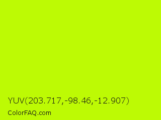 YUV 203.717,-98.46,-12.907 Color is a normal lime color and the nearest color is Lime #bfff00. Hex code #bdfa04 and RGB value is rgb(189,250,4). In RGB color space, this color is composed of 74% red, 98% green, 2% blue, In CMYK color space, this color is composed of 24% cyan, 0% magenta, 98% yellow , 2% black , In HSL color space, this color has a hue angle of 75° , 97% saturation and 50% lightness.