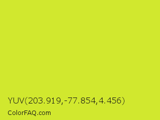 YUV 203.919,-77.854,4.456 Color is a normal yellow color and the nearest color is Pear #d1e231. Hex code #d1e82e and RGB value is rgb(209,232,46). In RGB color space, this color is composed of 82% red, 91% green, 18% blue, In CMYK color space, this color is composed of 10% cyan, 0% magenta, 80% yellow , 9% black , In HSL color space, this color has a hue angle of 67° , 80% saturation and 55% lightness.