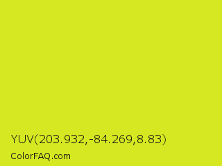 YUV 203.932,-84.269,8.83 Color is a normal yellow color and the nearest color is Piss Yellow #e1e115. Hex code #d6e821 and RGB value is rgb(214,232,33). In RGB color space, this color is composed of 84% red, 91% green, 13% blue, In CMYK color space, this color is composed of 8% cyan, 0% magenta, 86% yellow , 9% black , In HSL color space, this color has a hue angle of 65° , 81% saturation and 52% lightness.