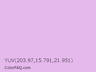 YUV 203.97,15.791,21.951 Color is a very light magenta color and the nearest color is French Lilac #ecc7ee. Hex code #e5b9ec and RGB value is rgb(229,185,236). In RGB color space, this color is composed of 90% red, 73% green, 93% blue, In CMYK color space, this color is composed of 3% cyan, 22% magenta, 0% yellow , 7% black , In HSL color space, this color has a hue angle of 292° , 57% saturation and 83% lightness.
