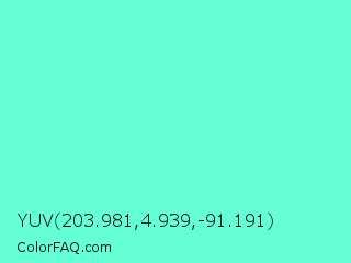 YUV 203.981,4.939,-91.191 Color is a light cyan color and the nearest color is Aquamarine #7fffd4. Hex code #64ffd6 and RGB value is rgb(100,255,214). In RGB color space, this color is composed of 39% red, 100% green, 84% blue, In CMYK color space, this color is composed of 61% cyan, 0% magenta, 16% yellow , 0% black , In HSL color space, this color has a hue angle of 164° , 100% saturation and 70% lightness.