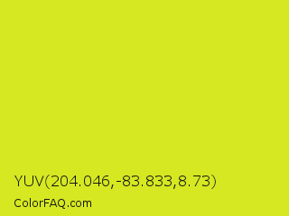YUV 204.046,-83.833,8.73 Color is a normal yellow color and the nearest color is Pear #d1e231. Hex code #d6e822 and RGB value is rgb(214,232,34). In RGB color space, this color is composed of 84% red, 91% green, 13% blue, In CMYK color space, this color is composed of 8% cyan, 0% magenta, 85% yellow , 9% black , In HSL color space, this color has a hue angle of 65° , 81% saturation and 52% lightness.