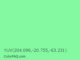 YUV 204.099,-20.755,-63.231 Color is a light green color and the nearest color is Pale Green #98fb98. Hex code #84f9a2 and RGB value is rgb(132,249,162). In RGB color space, this color is composed of 52% red, 98% green, 64% blue, In CMYK color space, this color is composed of 47% cyan, 0% magenta, 35% yellow , 2% black , In HSL color space, this color has a hue angle of 135° , 91% saturation and 75% lightness.