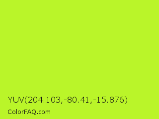 YUV 204.103,-80.41,-15.876 Color is a normal lime color and the nearest color is Green Yellow #adff2f. Hex code #baf529 and RGB value is rgb(186,245,41). In RGB color space, this color is composed of 73% red, 96% green, 16% blue, In CMYK color space, this color is composed of 24% cyan, 0% magenta, 83% yellow , 4% black , In HSL color space, this color has a hue angle of 77° , 91% saturation and 56% lightness.