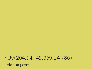 YUV 204.14,-49.369,14.786 Color is a light yellow color and the nearest color is Straw #e4d96f. Hex code #ddd768 and RGB value is rgb(221,215,104). In RGB color space, this color is composed of 87% red, 84% green, 41% blue, In CMYK color space, this color is composed of 0% cyan, 3% magenta, 53% yellow , 13% black , In HSL color space, this color has a hue angle of 57° , 63% saturation and 64% lightness.