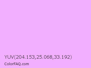 YUV 204.153,25.068,33.192 Color is a very light purple color and the nearest color is Rich Brilliant Lavender #f1a7fe. Hex code #f2afff and RGB value is rgb(242,175,255). In RGB color space, this color is composed of 95% red, 69% green, 100% blue, In CMYK color space, this color is composed of 5% cyan, 31% magenta, 0% yellow , 0% black , In HSL color space, this color has a hue angle of 290° , 100% saturation and 84% lightness.