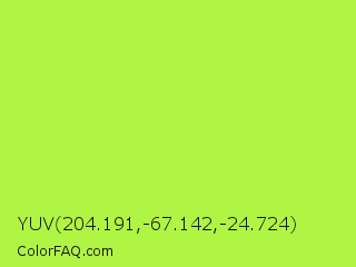 YUV 204.191,-67.142,-24.724 Color is a light green color and the nearest color is Green Lizard #a7f432. Hex code #b0f544 and RGB value is rgb(176,245,68). In RGB color space, this color is composed of 69% red, 96% green, 27% blue, In CMYK color space, this color is composed of 28% cyan, 0% magenta, 72% yellow , 4% black , In HSL color space, this color has a hue angle of 83° , 90% saturation and 61% lightness.