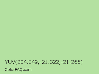 YUV 204.249,-21.322,-21.266 Color is a light green color and the nearest color is Granny Smith Apple #a8e4a0. Hex code #b4e1a1 and RGB value is rgb(180,225,161). In RGB color space, this color is composed of 71% red, 88% green, 63% blue, In CMYK color space, this color is composed of 20% cyan, 0% magenta, 28% yellow , 12% black , In HSL color space, this color has a hue angle of 102° , 52% saturation and 76% lightness.