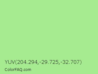 YUV 204.294,-29.725,-32.707 Color is a light green color and the nearest color is Granny Smith Apple Crayola #9de093. Hex code #a7eb90 and RGB value is rgb(167,235,144). In RGB color space, this color is composed of 65% red, 92% green, 56% blue, In CMYK color space, this color is composed of 29% cyan, 0% magenta, 39% yellow , 8% black , In HSL color space, this color has a hue angle of 105° , 69% saturation and 74% lightness.