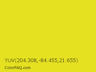 YUV 204.308,-84.455,21.655 Color is a normal yellow color and the nearest color is Piss Yellow #e1e115. Hex code #e5e121 and RGB value is rgb(229,225,33). In RGB color space, this color is composed of 90% red, 88% green, 13% blue, In CMYK color space, this color is composed of 0% cyan, 2% magenta, 86% yellow , 10% black , In HSL color space, this color has a hue angle of 59° , 79% saturation and 51% lightness.