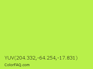 YUV 204.332,-64.254,-17.831 Color is a light green color and the nearest color is Inchworm #b2ec5d. Hex code #b8f04a and RGB value is rgb(184,240,74). In RGB color space, this color is composed of 72% red, 94% green, 29% blue, In CMYK color space, this color is composed of 23% cyan, 0% magenta, 69% yellow , 6% black , In HSL color space, this color has a hue angle of 80° , 85% saturation and 62% lightness.