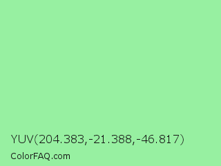 YUV 204.383,-21.388,-46.817 Color is a light green color and the nearest color is Pale Green #98fb98. Hex code #97f0a1 and RGB value is rgb(151,240,161). In RGB color space, this color is composed of 59% red, 94% green, 63% blue, In CMYK color space, this color is composed of 37% cyan, 0% magenta, 33% yellow , 6% black , In HSL color space, this color has a hue angle of 127° , 75% saturation and 77% lightness.