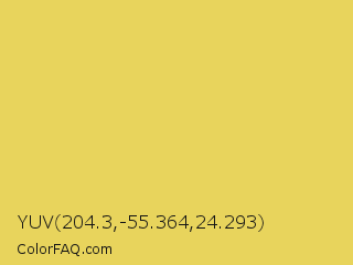 YUV 204.3,-55.364,24.293 Color is a light yellow color and the nearest color is Confetti #e9d75a. Hex code #e8d45c and RGB value is rgb(232,212,92). In RGB color space, this color is composed of 91% red, 83% green, 36% blue, In CMYK color space, this color is composed of 0% cyan, 9% magenta, 60% yellow , 9% black , In HSL color space, this color has a hue angle of 51° , 75% saturation and 64% lightness.