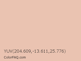 YUV 204.609,-13.611,25.776 Color is a very light orange color and the nearest color is Zinnwaldite #ebc2af. Hex code #eac3b1 and RGB value is rgb(234,195,177). In RGB color space, this color is composed of 92% red, 76% green, 69% blue, In CMYK color space, this color is composed of 0% cyan, 17% magenta, 24% yellow , 8% black , In HSL color space, this color has a hue angle of 19° , 58% saturation and 81% lightness.