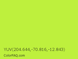 YUV 204.644,-70.816,-12.843 Color is a normal lime color and the nearest color is Green Lizard #a7f432. Hex code #bef03d and RGB value is rgb(190,240,61). In RGB color space, this color is composed of 75% red, 94% green, 24% blue, In CMYK color space, this color is composed of 21% cyan, 0% magenta, 75% yellow , 6% black , In HSL color space, this color has a hue angle of 77° , 86% saturation and 59% lightness.