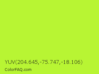 YUV 204.645,-75.747,-18.106 Color is a normal lime color and the nearest color is Green Yellow #adff2f. Hex code #b8f533 and RGB value is rgb(184,245,51). In RGB color space, this color is composed of 72% red, 96% green, 20% blue, In CMYK color space, this color is composed of 25% cyan, 0% magenta, 79% yellow , 4% black , In HSL color space, this color has a hue angle of 79° , 91% saturation and 58% lightness.