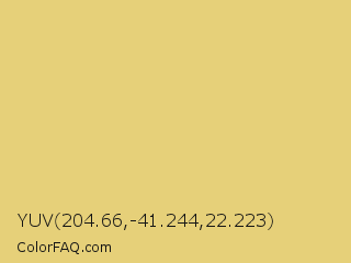 YUV 204.66,-41.244,22.223 Color is a light yellow color and the nearest color is Rob Roy #eac674. Hex code #e6d079 and RGB value is rgb(230,208,121). In RGB color space, this color is composed of 90% red, 82% green, 47% blue, In CMYK color space, this color is composed of 0% cyan, 10% magenta, 47% yellow , 10% black , In HSL color space, this color has a hue angle of 48° , 69% saturation and 69% lightness.