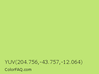 YUV 204.756,-43.757,-12.064 Color is a light green color and the nearest color is Yellow Green #c5e17a. Hex code #bfe574 and RGB value is rgb(191,229,116). In RGB color space, this color is composed of 75% red, 90% green, 45% blue, In CMYK color space, this color is composed of 17% cyan, 0% magenta, 49% yellow , 10% black , In HSL color space, this color has a hue angle of 80° , 68% saturation and 68% lightness.