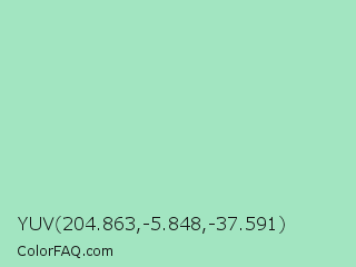 YUV 204.863,-5.848,-37.591 Color is a light green color and the nearest color is Sea Foam Green #9fe2bf. Hex code #a2e5c1 and RGB value is rgb(162,229,193). In RGB color space, this color is composed of 64% red, 90% green, 76% blue, In CMYK color space, this color is composed of 29% cyan, 0% magenta, 16% yellow , 10% black , In HSL color space, this color has a hue angle of 148° , 56% saturation and 77% lightness.
