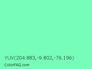 YUV 204.883,-9.802,-76.196 Color is a light green color and the nearest color is Aquamarine #7fffd4. Hex code #76fdb9 and RGB value is rgb(118,253,185). In RGB color space, this color is composed of 46% red, 99% green, 73% blue, In CMYK color space, this color is composed of 53% cyan, 0% magenta, 27% yellow , 1% black , In HSL color space, this color has a hue angle of 150° , 97% saturation and 73% lightness.