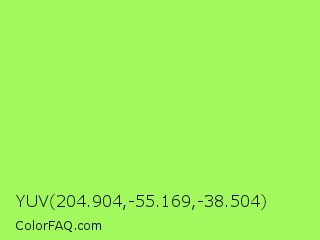 YUV 204.904,-55.169,-38.504 Color is a light green color and the nearest color is Inchworm #b2ec5d. Hex code #a1f95d and RGB value is rgb(161,249,93). In RGB color space, this color is composed of 63% red, 98% green, 36% blue, In CMYK color space, this color is composed of 35% cyan, 0% magenta, 63% yellow , 2% black , In HSL color space, this color has a hue angle of 94° , 93% saturation and 67% lightness.