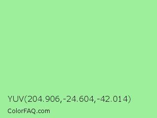 YUV 204.906,-24.604,-42.014 Color is a light green color and the nearest color is Pale Green #98fb98. Hex code #9def9b and RGB value is rgb(157,239,155). In RGB color space, this color is composed of 62% red, 94% green, 61% blue, In CMYK color space, this color is composed of 34% cyan, 0% magenta, 35% yellow , 6% black , In HSL color space, this color has a hue angle of 119° , 72% saturation and 77% lightness.