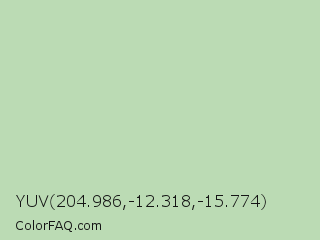 YUV 204.986,-12.318,-15.774 Color is a light green color and the nearest color is Pixie Green #c0d8b6. Hex code #bbdbb4 and RGB value is rgb(187,219,180). In RGB color space, this color is composed of 73% red, 86% green, 71% blue, In CMYK color space, this color is composed of 15% cyan, 0% magenta, 18% yellow , 14% black , In HSL color space, this color has a hue angle of 109° , 35% saturation and 78% lightness.