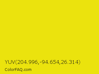 YUV 204.996,-94.654,26.314 Color is a normal yellow color and the nearest color is Piss Yellow #e1e115. Hex code #ebe30d and RGB value is rgb(235,227,13). In RGB color space, this color is composed of 92% red, 89% green, 5% blue, In CMYK color space, this color is composed of 0% cyan, 3% magenta, 94% yellow , 8% black , In HSL color space, this color has a hue angle of 58° , 90% saturation and 49% lightness.