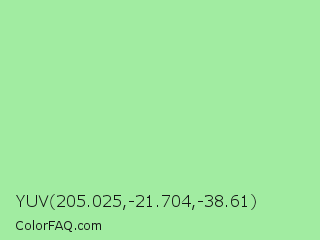YUV 205.025,-21.704,-38.61 Color is a light green color and the nearest color is Granny Smith Apple #a8e4a0. Hex code #a1eca1 and RGB value is rgb(161,236,161). In RGB color space, this color is composed of 63% red, 93% green, 63% blue, In CMYK color space, this color is composed of 32% cyan, 0% magenta, 32% yellow , 7% black , In HSL color space, this color has a hue angle of 120° , 66% saturation and 78% lightness.