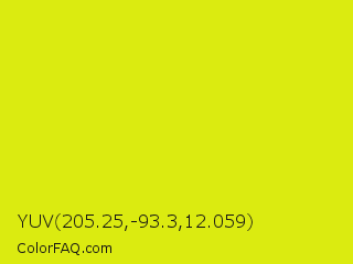 YUV 205.25,-93.3,12.059 Color is a normal yellow color and the nearest color is Piss Yellow #e1e115. Hex code #dbeb10 and RGB value is rgb(219,235,16). In RGB color space, this color is composed of 86% red, 92% green, 6% blue, In CMYK color space, this color is composed of 7% cyan, 0% magenta, 93% yellow , 8% black , In HSL color space, this color has a hue angle of 64° , 87% saturation and 49% lightness.