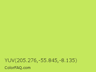 YUV 205.276,-55.845,-8.135 Color is a light lime color and the nearest color is June Bud #bdda57. Hex code #c4e85c and RGB value is rgb(196,232,92). In RGB color space, this color is composed of 77% red, 91% green, 36% blue, In CMYK color space, this color is composed of 16% cyan, 0% magenta, 60% yellow , 9% black , In HSL color space, this color has a hue angle of 75° , 75% saturation and 64% lightness.