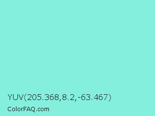 YUV 205.368,8.2,-63.467 Color is a light cyan color and the nearest color is Riptide #8be6d8. Hex code #85efde and RGB value is rgb(133,239,222). In RGB color space, this color is composed of 52% red, 94% green, 87% blue, In CMYK color space, this color is composed of 44% cyan, 0% magenta, 7% yellow , 6% black , In HSL color space, this color has a hue angle of 170° , 77% saturation and 73% lightness.