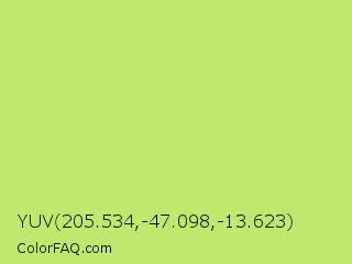 YUV 205.534,-47.098,-13.623 Color is a light green color and the nearest color is Yellow Green #c5e17a. Hex code #bee86e and RGB value is rgb(190,232,110). In RGB color space, this color is composed of 75% red, 91% green, 43% blue, In CMYK color space, this color is composed of 18% cyan, 0% magenta, 53% yellow , 9% black , In HSL color space, this color has a hue angle of 81° , 73% saturation and 67% lightness.