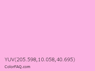 YUV 205.598,10.058,40.695 Color is a very light magenta color and the nearest color is Light Hot Pink #ffb3de. Hex code #fcb2e2 and RGB value is rgb(252,178,226). In RGB color space, this color is composed of 99% red, 70% green, 89% blue, In CMYK color space, this color is composed of 0% cyan, 29% magenta, 10% yellow , 1% black , In HSL color space, this color has a hue angle of 321° , 93% saturation and 84% lightness.