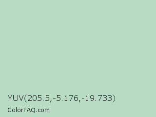 YUV 205.5,-5.176,-19.733 Color is a light green color and the nearest color is Surf #bbd7c1. Hex code #b7dbc3 and RGB value is rgb(183,219,195). In RGB color space, this color is composed of 72% red, 86% green, 76% blue, In CMYK color space, this color is composed of 16% cyan, 0% magenta, 11% yellow , 14% black , In HSL color space, this color has a hue angle of 140° , 33% saturation and 79% lightness.