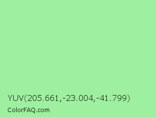YUV 205.661,-23.004,-41.799 Color is a light green color and the nearest color is Granny Smith Apple #a8e4a0. Hex code #9eef9f and RGB value is rgb(158,239,159). In RGB color space, this color is composed of 62% red, 94% green, 62% blue, In CMYK color space, this color is composed of 34% cyan, 0% magenta, 33% yellow , 6% black , In HSL color space, this color has a hue angle of 121° , 72% saturation and 78% lightness.
