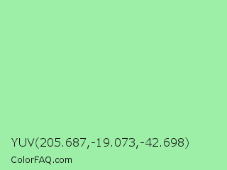 YUV 205.687,-19.073,-42.698 Color is a light green color and the nearest color is Teal Deer #99e6b3. Hex code #9deea7 and RGB value is rgb(157,238,167). In RGB color space, this color is composed of 62% red, 93% green, 65% blue, In CMYK color space, this color is composed of 34% cyan, 0% magenta, 30% yellow , 7% black , In HSL color space, this color has a hue angle of 127° , 70% saturation and 77% lightness.