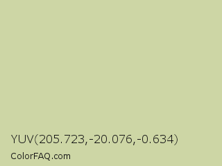 YUV 205.723,-20.076,-0.634 Color is a light lime color and the nearest color is Green Mist #cbd3b0. Hex code #cdd6a5 and RGB value is rgb(205,214,165). In RGB color space, this color is composed of 80% red, 84% green, 65% blue, In CMYK color space, this color is composed of 4% cyan, 0% magenta, 23% yellow , 16% black , In HSL color space, this color has a hue angle of 71° , 37% saturation and 74% lightness.