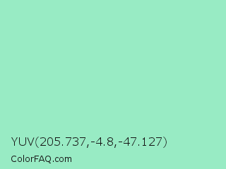 YUV 205.737,-4.8,-47.127 Color is a light green color and the nearest color is Sea Foam Green #9fe2bf. Hex code #98ebc4 and RGB value is rgb(152,235,196). In RGB color space, this color is composed of 60% red, 92% green, 77% blue, In CMYK color space, this color is composed of 35% cyan, 0% magenta, 17% yellow , 8% black , In HSL color space, this color has a hue angle of 152° , 67% saturation and 76% lightness.